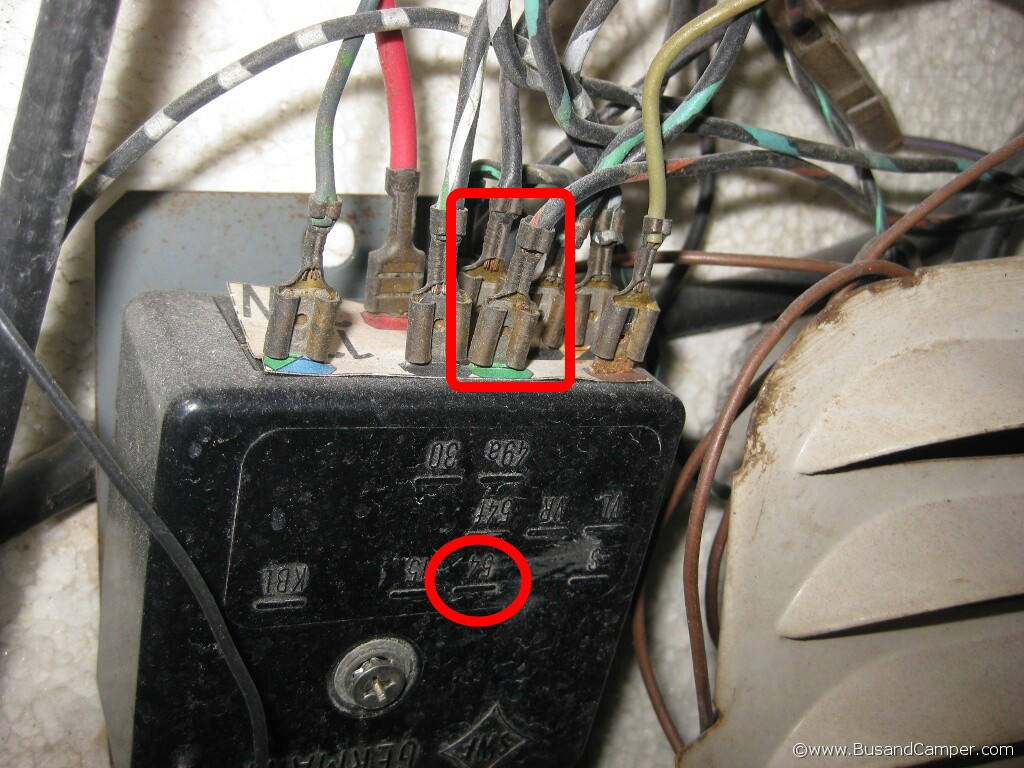 The pressure switch is a simple device – at around 15 psi or so the contacts should close. One side is connected to terminal 15 of the fusebox – switched with ignition, the other will find its way to the indicator stalk (early buses) or the 9 pin relay in 66 or so Buses. Here is a picture of the 9 pin relay in our 66 Bus with the black / red wire on terminal 54 circled;